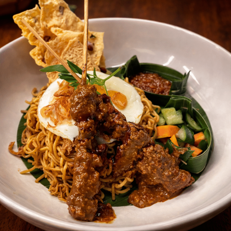 Fried Noodles Chicken is one of Indonesia’s most iconic comfort dishes. Rich in flavor, wok tossed to perfection, and layered with texture, this fried noodle favorite is a staple across the country. At TEMPLE by Ginger Moon in Kuta, we elevate this classic with egg, chicken satay, acar, and crispy peyek for a bold and balanced finish.